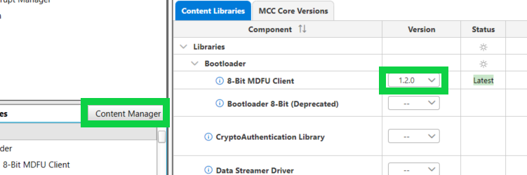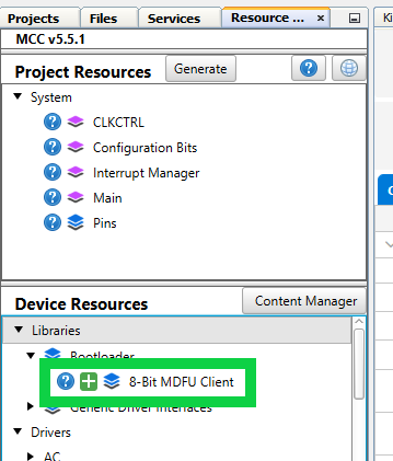 Add the 8-Bit MDFU Client library into the Project Resources tab from Device Resources. In previous versions of MCC, a user needed to manually attach all peripheral drivers required by their library, using the Device Resources tab. The new MCC Melody allows users to select the library needed for the project from the Device Resources and Melody can bring in all the dependencies.