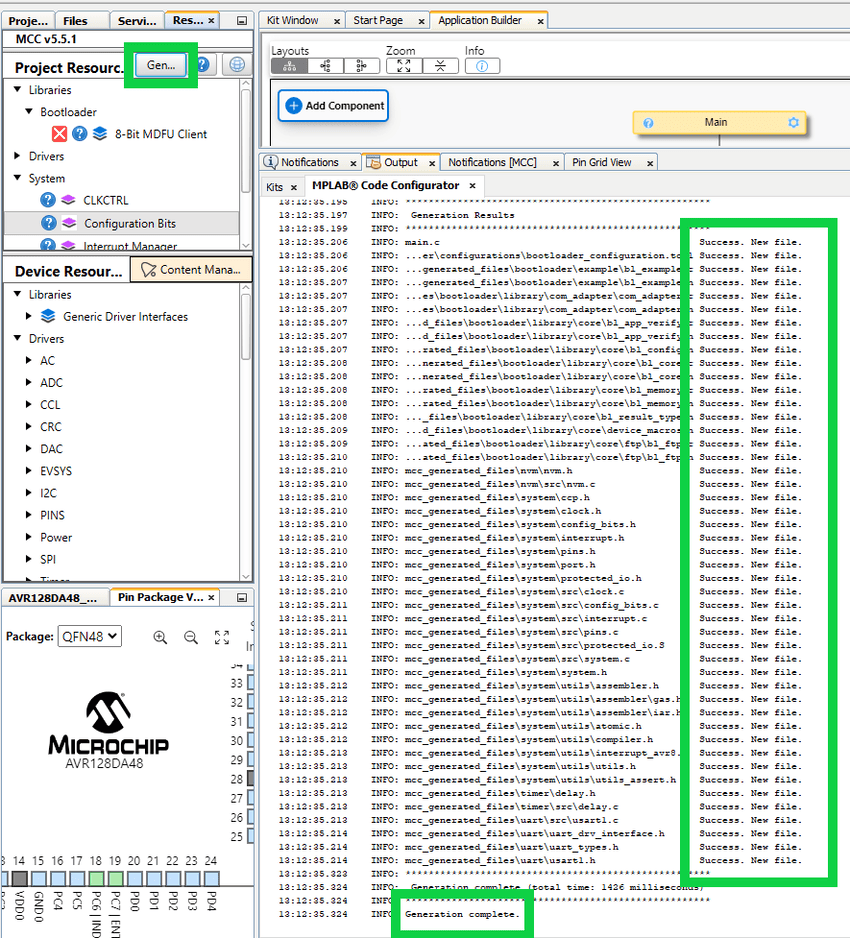 Note: Refer to the Memory Organization section of the device data sheet for more information on memory partition.Note: The “BOOTSIZE” field in the Configuration Bit Setup uses decimal values. Make sure to convert the calculated hex value to decimal value.Setting the CODESIZE fuse is an optional action that can be done in instances where a user wants more control over the various portions of memory. If this value is set to 0x00, the bootloader will still operate normally, but it is not possible to specify an AppData section of memory without first configuring the Codesize fuse. Refer to the memory map presented in the data sheet on how to configure this option.Figure 4-126. BOOTSIZE - Configuration Bits Figure 4-127. 8-Bit MDFU Client Memory Options Note: The “CODESIZE” field in the Configuration Bit Setup uses decimal values. Make sure to convert the calculated hex value to decimal value. - Click Generate after updating the BOOT and CODE FUSE values in the MCC UI