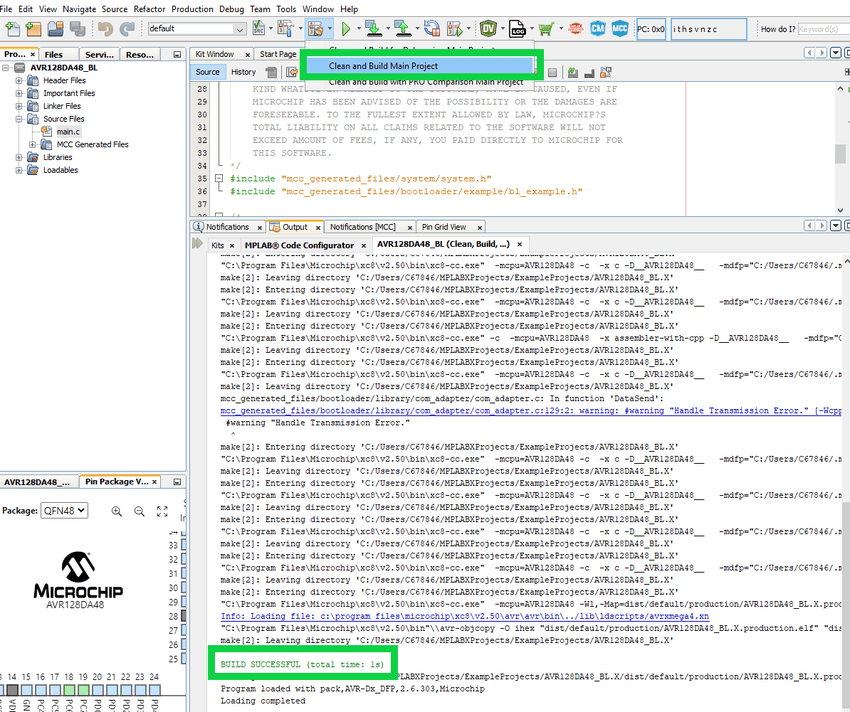 Click the “Clean and Build” icon drop-down option and select Clean and Build Main Project to compile the bootloader code.