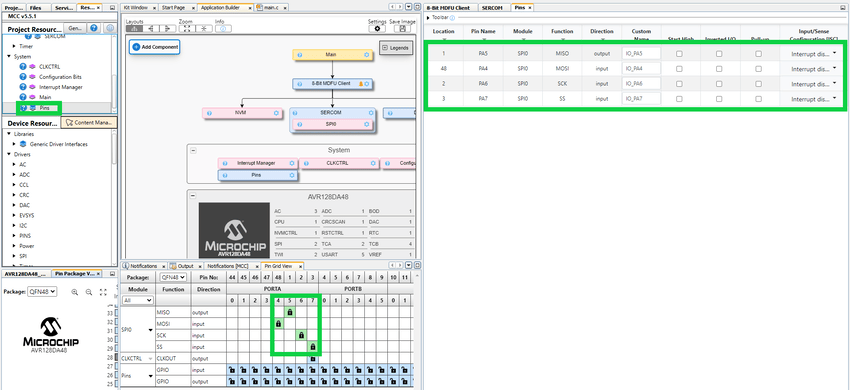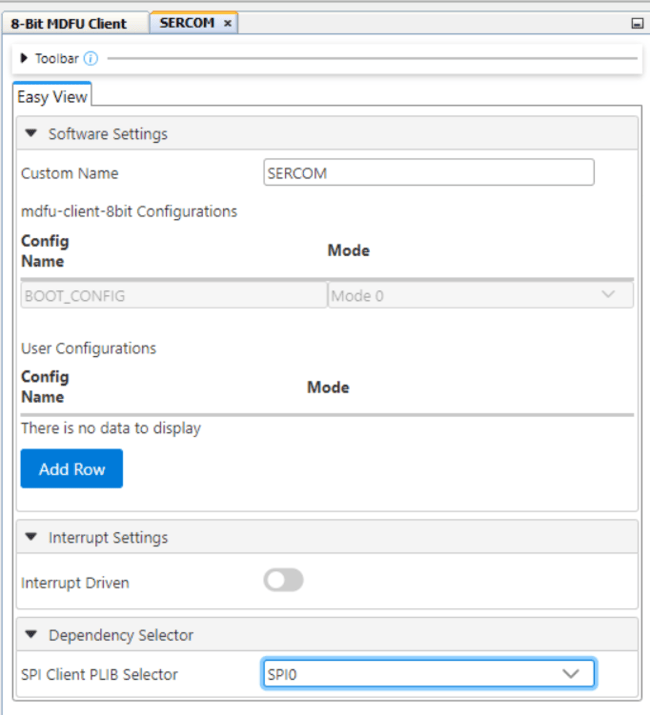 Select SPI from the Communication Protocol drop-down list in the 8-Bit MDFU Client Easy View tab.Figure 4-104. SPI Communication Select an instance of the SPI driver from the SPI Client PLIB Selector drop-down list. For example, SPI0 and the driver settings will open up.Figure 4-105. SPI Client PLIB Selector Figure 4-106. SERCOM Settings Make sure the correct SDI (MOSI), SDO (MISO), SS and SCK pins are selected and rename the SS pin to CHIP_SELECT.Note: For some devices, the SPI PLIB will automatically select the proper pins. Validate that what has been set is correct for your hardware configuration.Figure 4-107. SPI Pin Settings I2C: