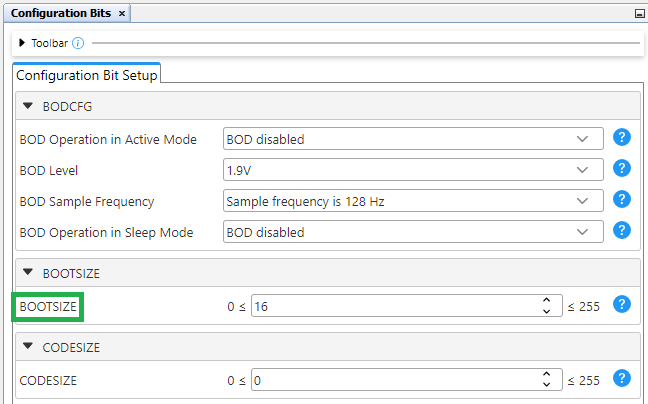 BOOTSIZE can be calculated after compiling the project for the first time.Tip: For example, the AVR128DA48 has a total of 256 pages (range is 0 to 255) so set the value to 254.