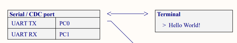 Figure 4-99. UART Communication For the bootloader to communicate with the host application (PyMDFU) over USART, a driver instance needs to be configured to exchange data through the serial ports on the target device. To understand which communication ports are required to be opened for the device in use, check the schematics and look for the Serial or CDC Ports definition for the Curiosity Nano board, as shown in the image below. Using this definition, the MCU is communicating through the PC0 pin for transmitting data serially and the PC1 pin for receiving data serially.