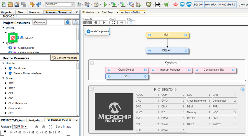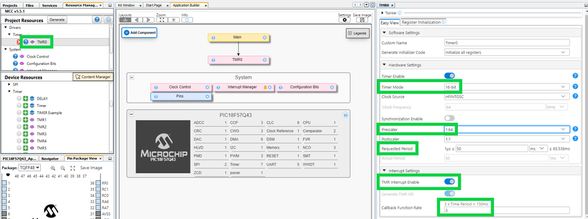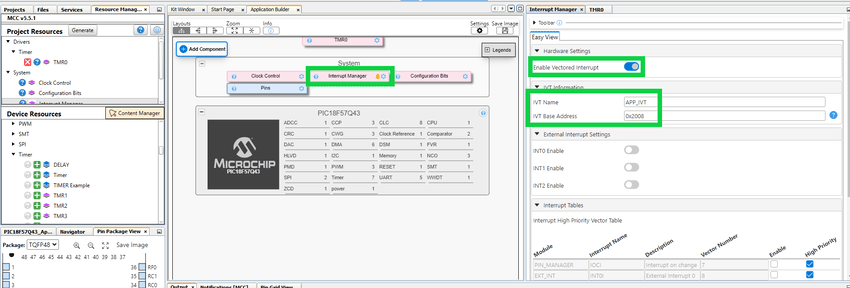 Description: The following section will walk through the setup of an application that is blinking the LED using a timer interrupt instead of using the delay driver. This section will use the Interrupt Vector Table on the PIC18F57Q43 Curiosity Nano.