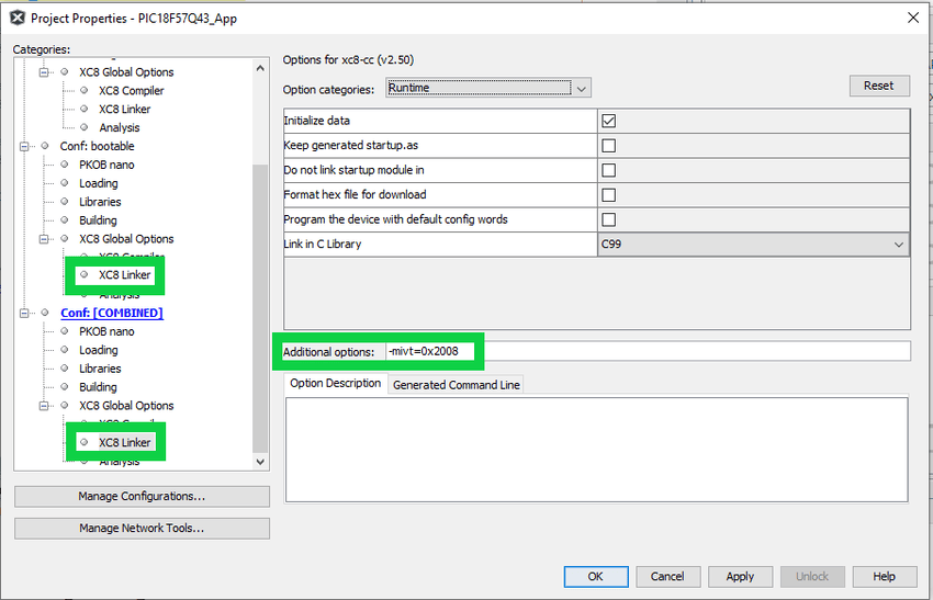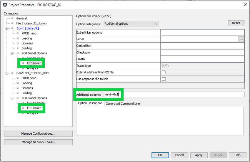 -mivt=0x8to the text box in the middle of the window.Important: Add the linker setting into all configurations.Figure 5-64. Set the Bootloader IVT Linker Setting