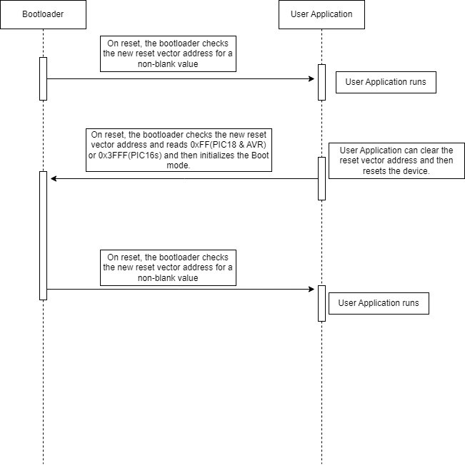 In Check Reset Vector verification, the program flow checks the end application’s Reset Vector address. This verification method relies on the assumption that if there is a 0xFF value at the start of that Reset Vector address, then the device has been erased and the bootloader needs to start loading a new application image. In the event of a device Reset or a normal start-up, this verification method will check for a 0xFF in the application Reset Vector space and, if needed, will start running the bootloader. Otherwise, the bootloader will just start running the end application that is present at that address.