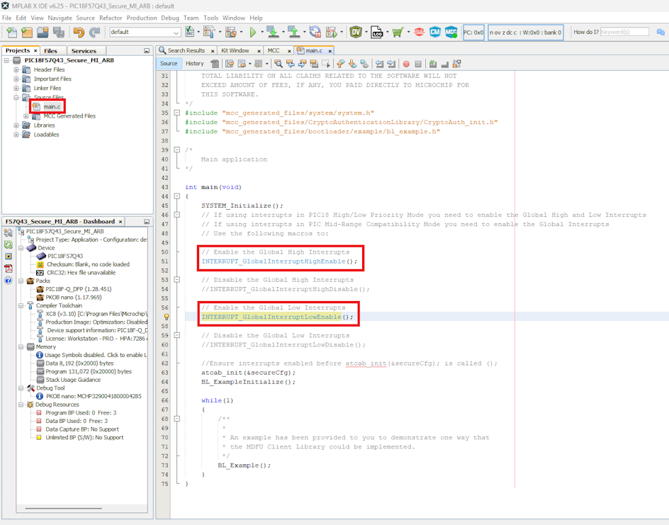 main.cfile, uncomment the interrupt enable lines.For PIC devices: