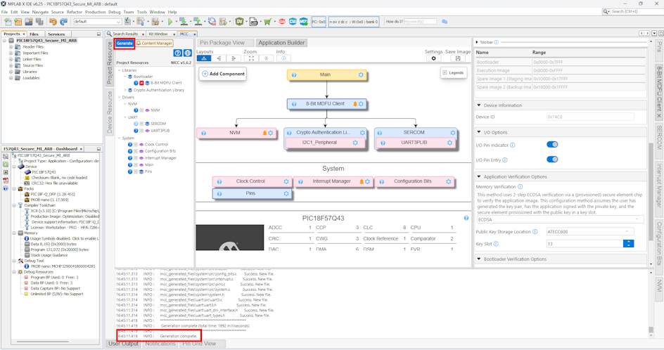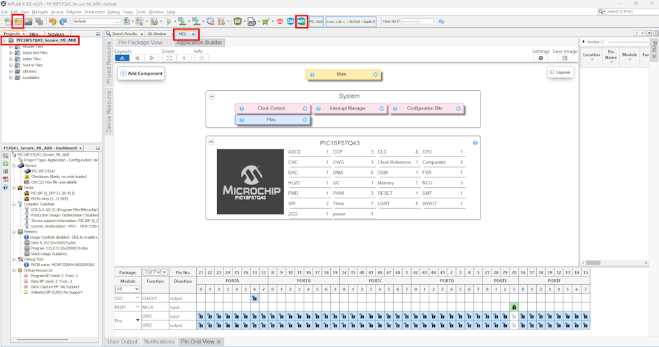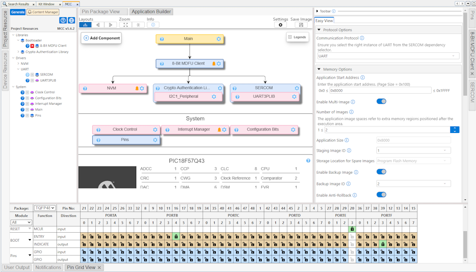 Description: This section details a full secure bootloader use case on the PIC18F57Q43 microcontroller, which applies to many variants of the PIC18F family and can also be extrapolated to other 8-bit PIC and AVR chips. This example uses the PIC18F57Q43 Curiosity Nano board for demonstration and variations when using AVR128DA48 Curiosity Nano. Refer to the board schematics for configuration information.