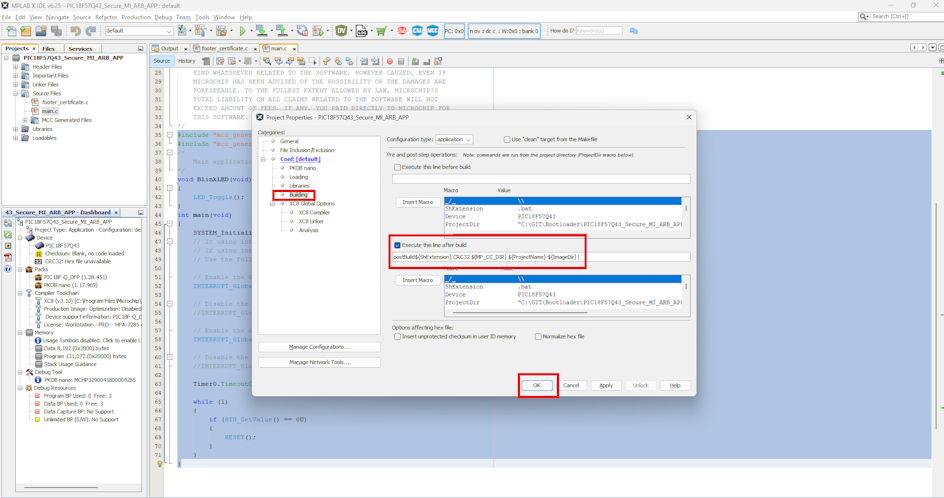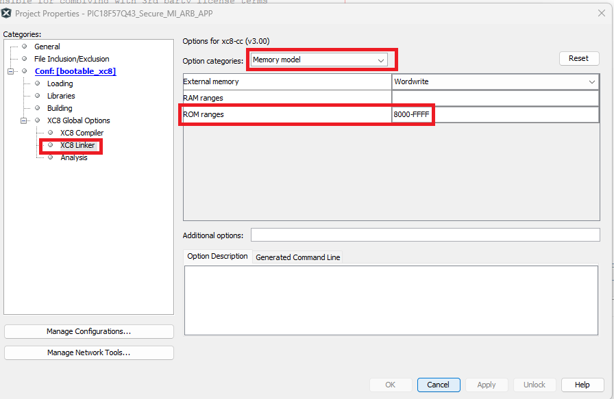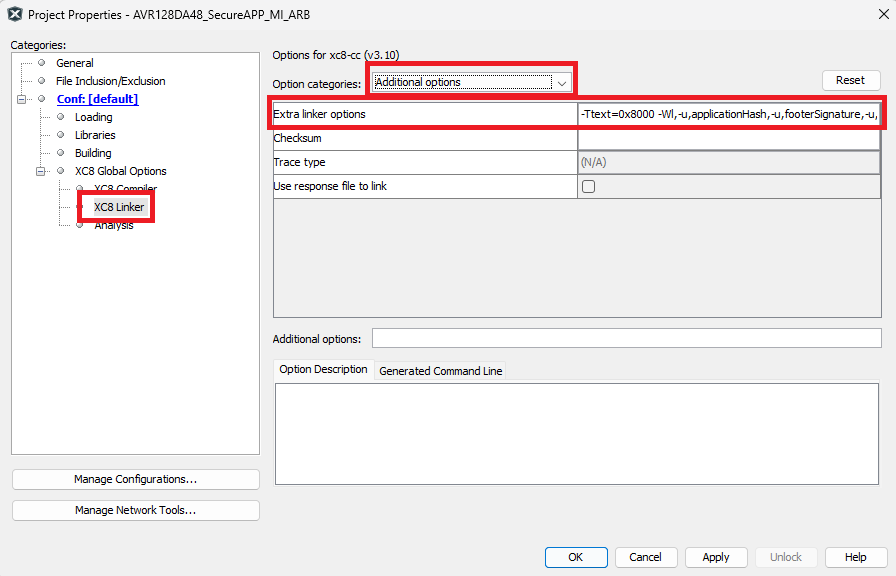 -Wl,-u,checksumStart,-u,verificationStartAddress,-u,verificationEndAddress,-u,applicationVersion,-u,applicationId,-u,__TEXT_REGION_LENGTH__=<applicationId image start address: applicationId image end address>,-Ttext=<applicationId image start>XC8 Linker Settings