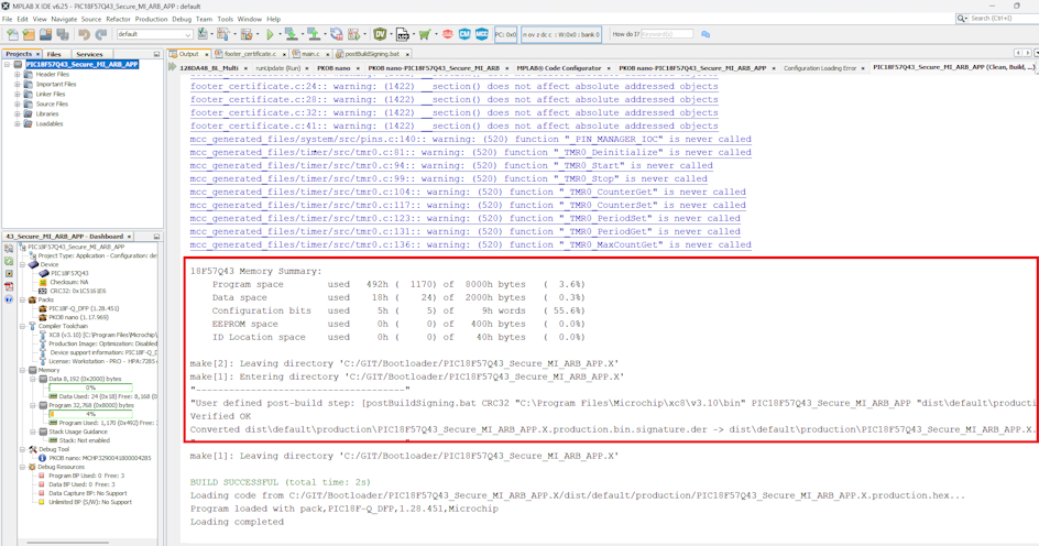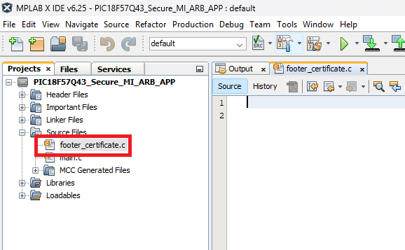 Understanding the variables stored in the footer data of the Flash memory:#define EXECUTION_SPACE (0x0000) #define STAGING_SPACE (0x0001) #define BACKUP_SPACE (0x0002) #include <stdint.h> #ifdef __XC8__ #include <xc.h> #endif volatile const uint16_t #ifdef __XC8__ __at(0xFFAE) #endif applicationSlotId __attribute__((used, section("application_slot_id"))) = EXECUTION_SPACE; volatile const uint32_t #ifdef __XC8__ __at(0xFFB0) #endif applicationVersion __attribute__((used, section("application_version"))) = 0x00000100; volatile const uint32_t #ifdef __XC8__ __at(0xFFB4) #endif verificationEndAddress __attribute__((used, section("application_verify_end"))) = 0x0000FFBBU; volatile const uint32_t #ifdef __XC8__ __at(0xFFB8) #endif verificationStartAddress __attribute__((used, section("application_verify_start"))) = 0x00008000U; volatile const uint32_t #ifdef __XC8__ __at(0xFFBC) #endif footerSignature[] __attribute__((used, section("atecc608_certificate"))) = { 0, 0, 0, 0, 0, 0, 0, 0, 0, 0, 0, 0, 0, 0, 0, 0 }; volatile const uint32_t #ifdef __XC8__ __at(0xFFFC) #endif applicationHash __attribute__((used, section("application_hash"))) = 0xFFFFFFFFU;Table 5-4. Footer Certificate Data Variable Purpose Address applicationSlotId This is the location where the current image will be stored. Current Example Value: EXECUTION_IMAGE_ID