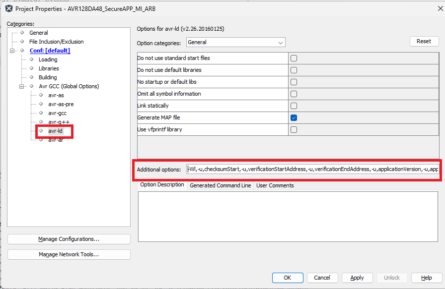 For an AVR-based bootloader client with applicationId image range of 0x8000-0xFFFF the linker settings are as follows: