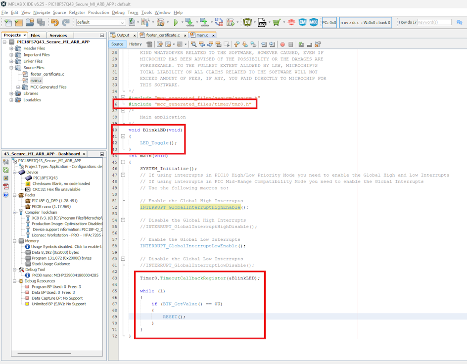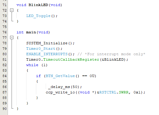 #include "mcc_generated_files/system/system.h" #include "mcc_generated_files/timer/tmr0.h" /* Main application */ void BlinkLED(void) { LED_Toggle(); } int main(void) { SYSTEM_Initialize(); // If using interrupts in PIC18 High/Low Priority mode, enable the Global High and Low Interrupts // If using interrupts in PIC Mid-Range Compatibility mode, enable the Global Interrupts // Use the following macros to: // Enable the Global High Interrupts INTERRUPT_GlobalInterruptHighEnable(); // Disable the Global High Interrupts //INTERRUPT_GlobalInterruptHighDisable(); // Enable the Global Low Interrupts INTERRUPT_GlobalInterruptLowEnable(); // Disable the Global Low Interrupts //INTERRUPT_GlobalInterruptLowDisable(); Timer0.TimeoutCallbackRegister(&BlinkLED); while (1) { if (BTN_GetValue() == 0U) { RESET(); } } }