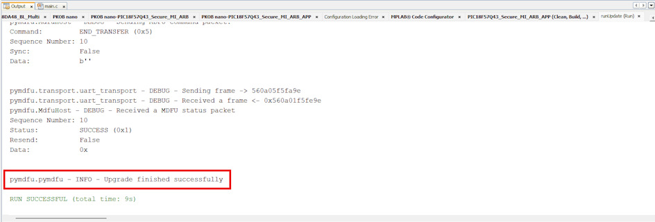 pymdfu update --tool serial --image output.img --baudrate 115200 --port <COM PORT name>The update will run and finished successfully.