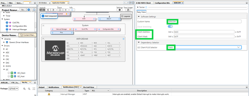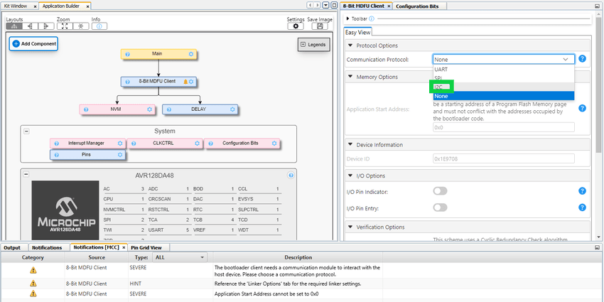 Before moving on, address the warnings in the Notifications [MCC] tab if there are any. For example, NVM options must be enabled and a notification will be present if it was not set automatically.