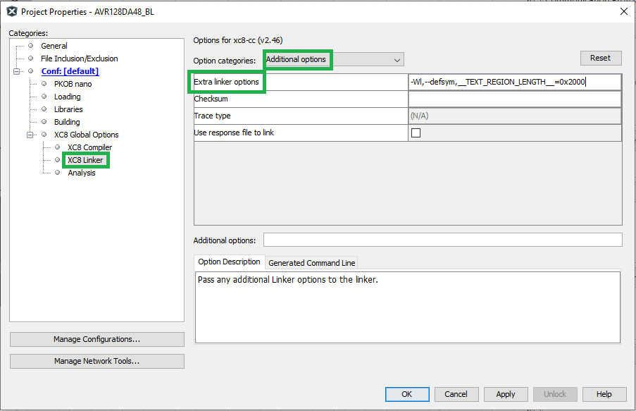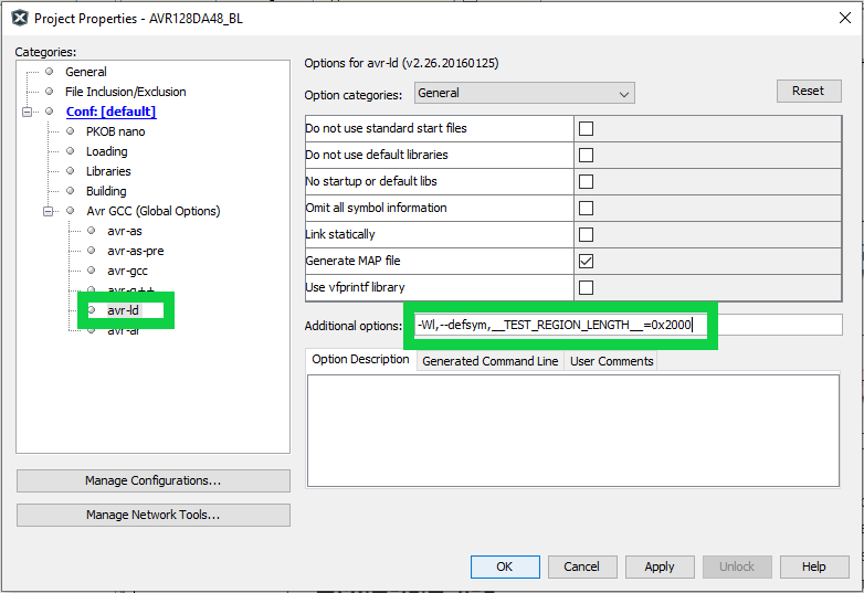 BOOTSIZE can be calculated after compiling the project for the first time.Tip: For example, the AVR128DA48 has a total of 256 pages (range is 0 to 255) so set the value to 254.