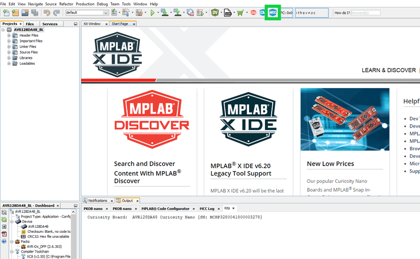 MCC opens up automatically when a new project is created. If not, click the MCC button in the menu bar to start the MPLAB Code Configurator.