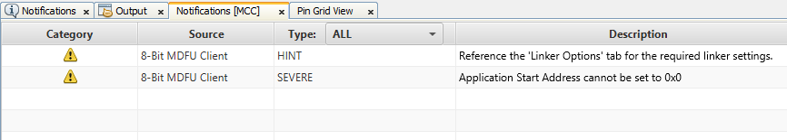 Note: Ignore the notifications for the application start address and linker settings for now.Figure 5-118. Notification [MCC] Tab