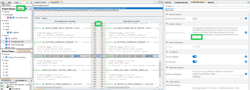 Note: The “CODESIZE” field in the Configuration Bit Setup uses decimal values. Make sure to convert the calculated hex value to decimal value. - Click Generate after updating the BOOT and CODE FUSE values in the MCC UI