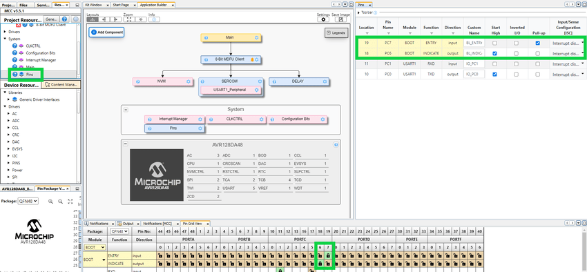 Go back to MPLAB X IDE and navigate to the Pin Grid View tab in the bottom center of the screen. Then select the RC6 as the output pin and RC7 as the input pin for BOOT INDICATE and BOOT ENTRY in the grid, respectively. Open the Project Resources> System>Pins to view the specific GPIO pin settings.