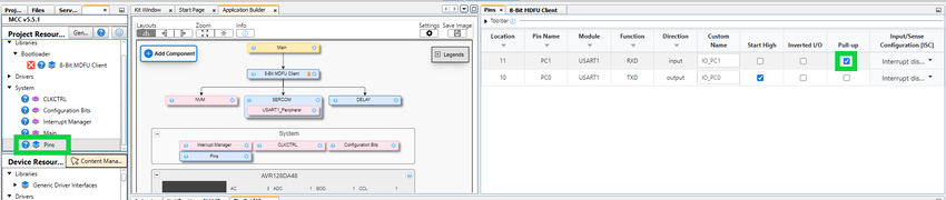 Add the 8-Bit MDFU Client library into the Project Resources tab from Device Resources. In previous versions of MCC, a user needed to manually attach all peripheral drivers required by their library, using the Device Resources tab. The new MCC Melody allows users to select the library needed for the project from the Device Resources and Melody can bring in all the dependencies.