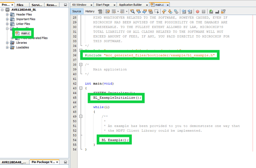 bl_example.cfile provides routines for running a basic bootloader update process. Themain.cfile will be automatically updated to call theBL_ExampleInitialize()andBL_Example(). If not, open themain.cfile, and add the code shown below.Figure 5-123. Bootloader Update Process Call