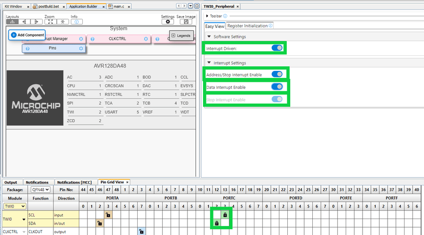 Important: It is strongly suggested to use interrupts for I2C communication. Follow the steps provided in the Supporting Interrupts for AVR® Devices section to finish setting up interrupts in the ecosystem.Figure 5-111. I2C Settings