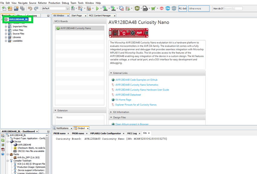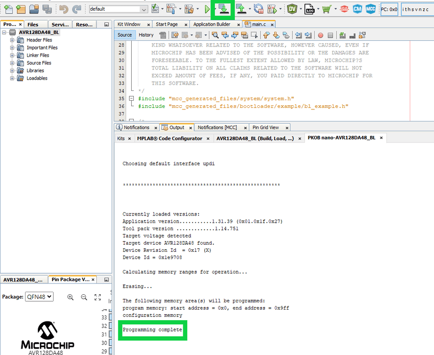 To prepare the chip to bootload, click the Make and Program Device button. After this programming process ends, the LED on the AVR128DA48 Curiosity Nano board will stay ON continuously.