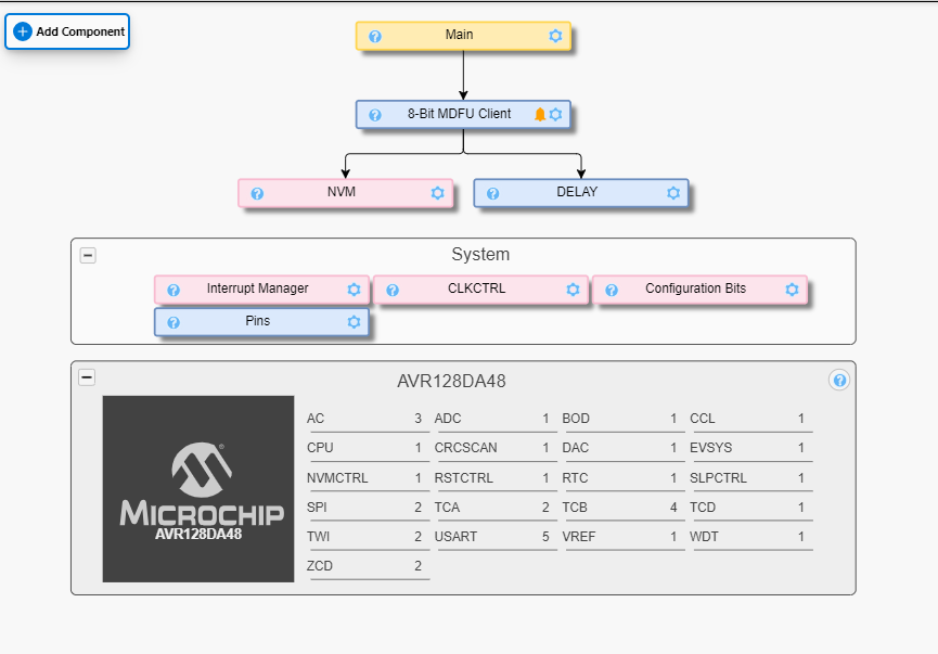 Confirm that the 8-Bit MDFU Client library has been included into the Application Builder window. The Application Builder UI will import all the required peripheral driver dependencies such as the NVM and Timer Delay modules and link them to the 8-Bit MDFU Client library.