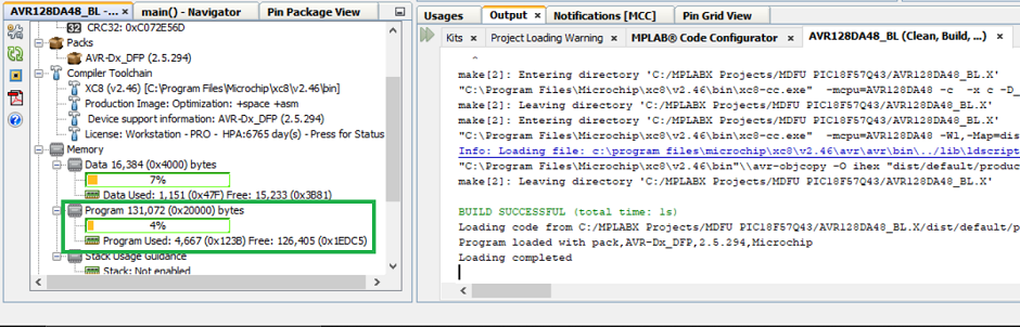 Note: Adding extra space in the Boot section of Flash is a design decision that must be considered on an as-needed basis.The device used in this example, AVR128DA48, has the Flash memory divided into 100h pages with each page consisting of 200h bytes. Allocating 10h pages will provide the bootloader section with 2000h bytes (10h pages x 200h bytes) of Program Flash Memory and the remaining 0x1E000 for the user application.