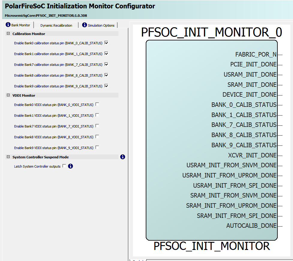 When using the System Controller Suspend mode feature, all system controller outputs to the FPGA fabric are set to "0." Therefore, it is important to configure the PFSOC_INIT_MONITOR IP core to latch the system controller outputs during SCSM, especially if the output signals are used to derive a reset signal for the user logic. Further, the exposed CLK_160_MHZ port must be connected to the internal 160 MHz RCOSC.