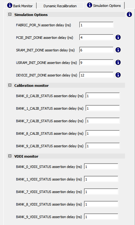 PolarFire SoC Initialization Monitor provides simulation support. Use the Simulation Options tab to specify the time of releasing the output signals from the zero time instance. The following figure shows the Simulation Options tab.