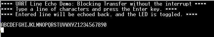 This example shows the read and write operation over a UART in a blocking manner. The CPU polls the peripheral register continuously to manage the transfer. It receives a line of characters from the terminal window and echoes them back.