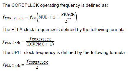 400 to 800 MHz PLLs PLLs are not fractional. PLLA clock ouput is: PLLACK = MAINCK / DIVA * MULA UPLL requires a 12 MHz crystal to generate 12x40 = 480 MHz frequency. |