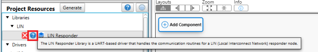For details on the MCC Melody LIN Responder functions and use case examples, refer to the MCC Melody LIN Responder Library API Reference . The API Reference can also be accessed from MCC Melody by clicking the question mark icon next to the LIN Responder library component in the Project Resources window or by hovering over the LIN Responder Library component in Builder View.