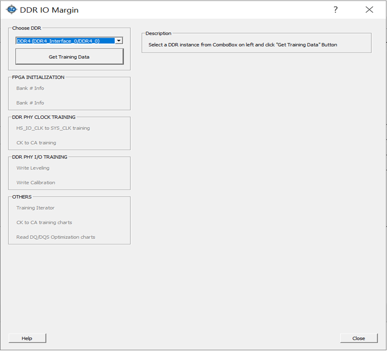 (Ask a Question)To access the Debug DDR IO Margin feature, select Debug DDR Memory from the main SmartDebug window. This option is available only for DDR3/DDR4/LPDDR3 memory configurations. This option is not visible when DDR memory is not used in the design. The default view of the DDR IO Margin window.