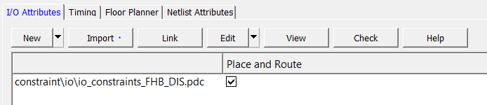 io_constraints_FHB_DIS.pdc or io_constraints_FHB_EN.pdcfile, as shown in the following figure. Theio_constraints_FHB_DIS.pdc or io_constraints_FHB_EN.pdcfile contains the I/O assignment for reference clock, switches and XCVR Lanes.Figure 4-1. I/O Attributes Tab