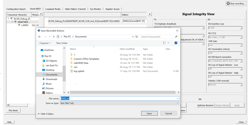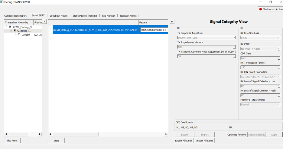 (Ask a Question)The Start Record Actions option is used to record the register sequence of XCVR operations into a file. This option is available at the top-right on the Debug Transceiver window, as shown in the following figure.