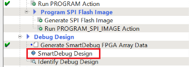 - Select Generate SmartDebug FPGA Array Data to generate data for SmartDebug Design. Once the data is generated, a green tick mark is seen on the left side of the option indicating that the data generation is successful.