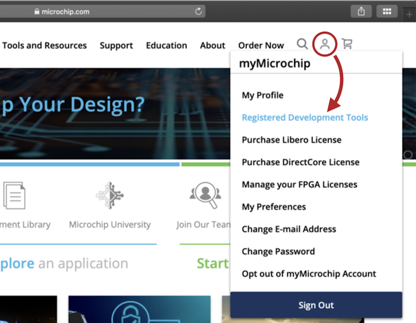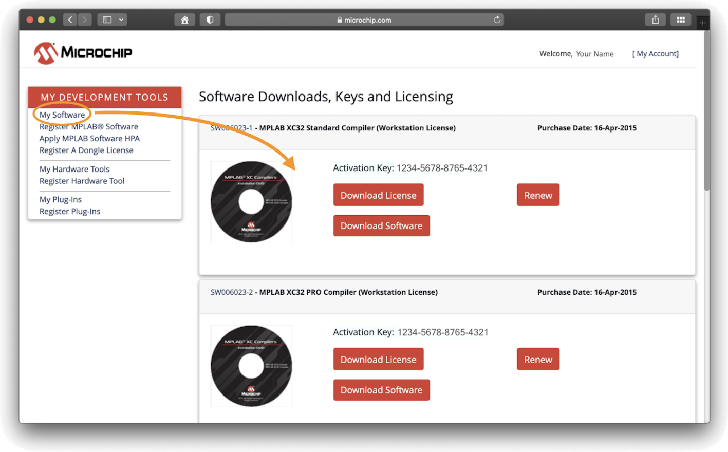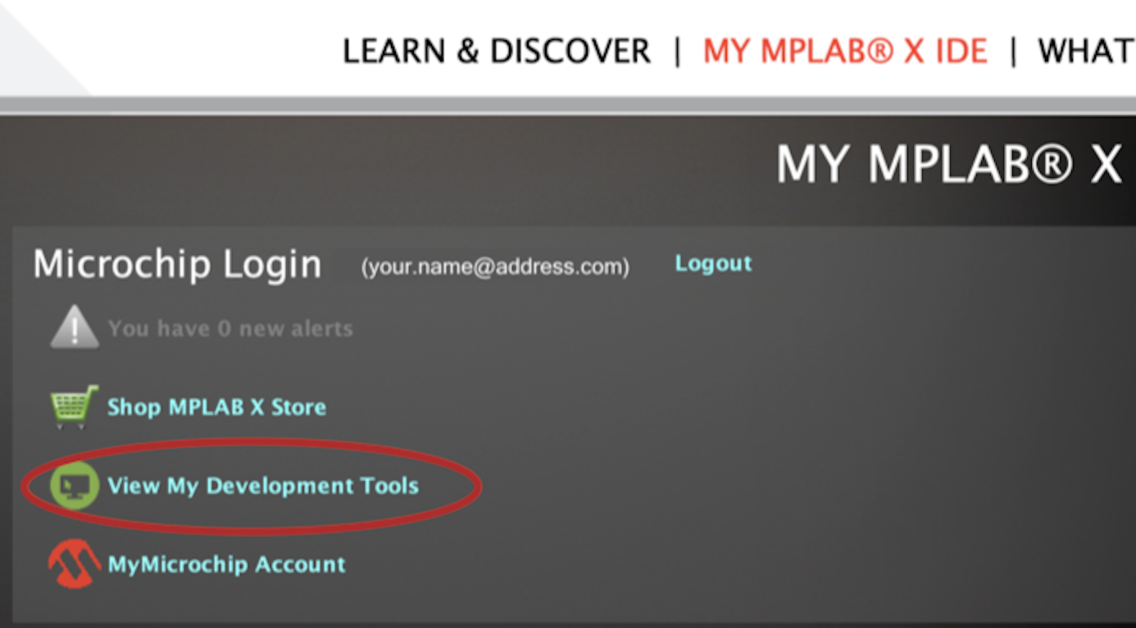 your mySoftware account by selecting Registered Development Tools from the myMicrochip pull-down menu, as shown in the image