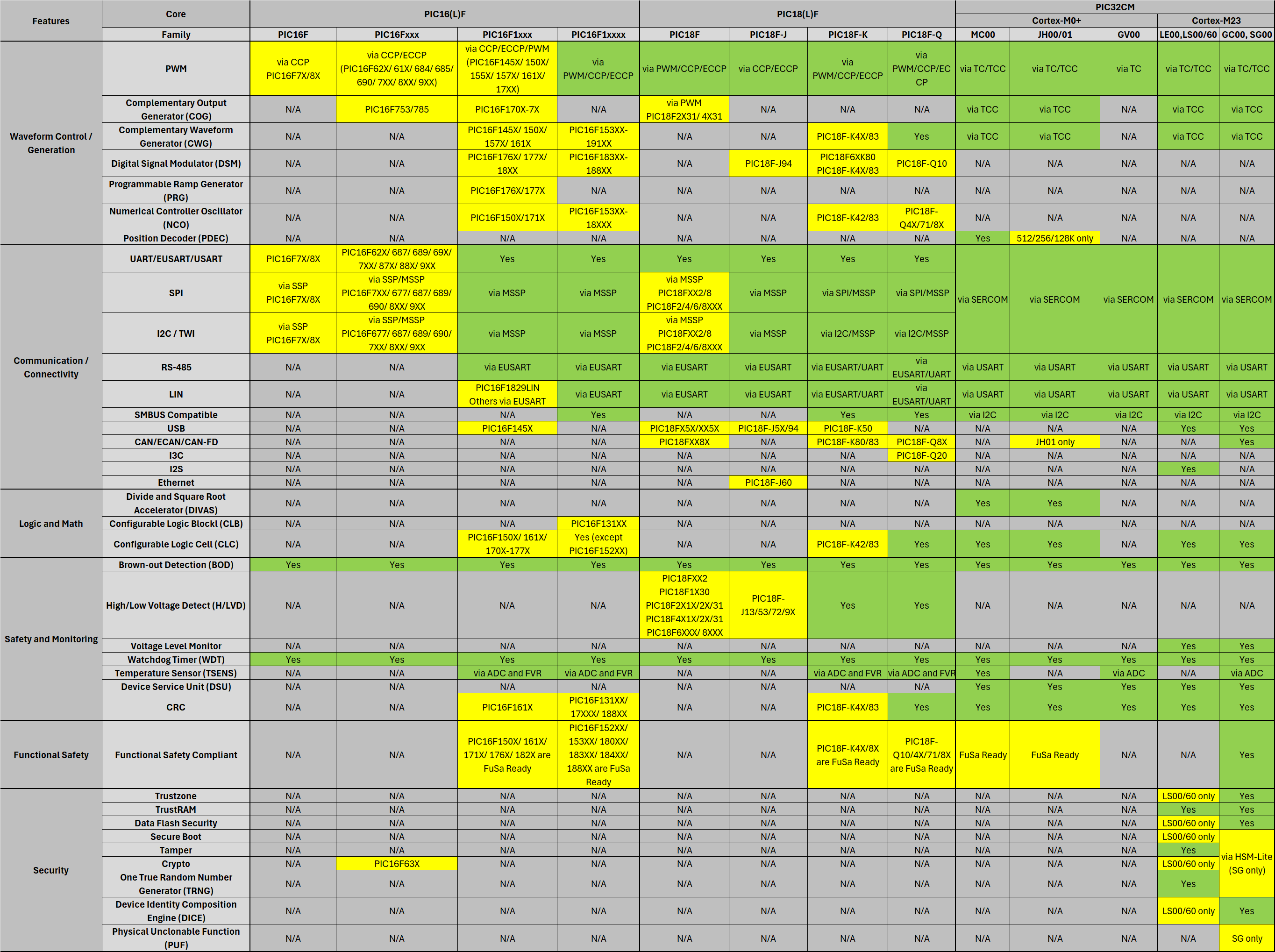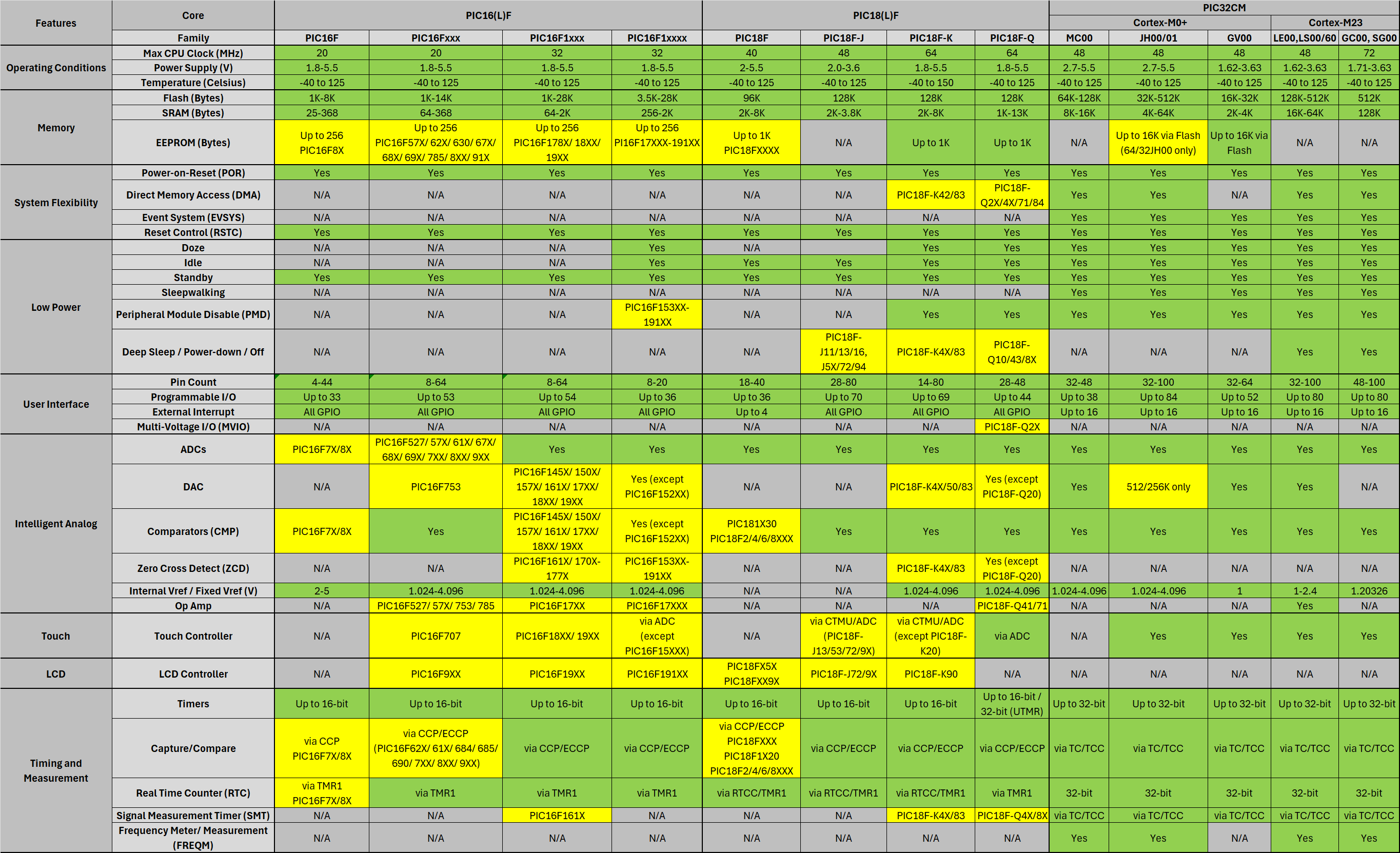 This section summarizes the system and peripheral features for each family of devices: PIC16F, PIC18F, and PIC32CM.