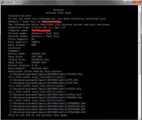 serial terminal application as shown below. This shows the successful reception of print