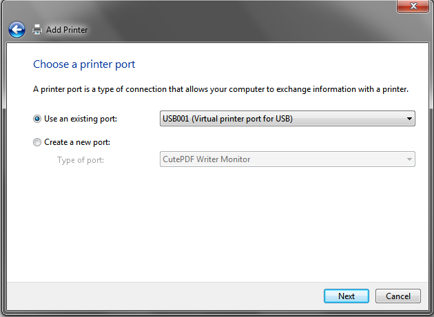 choose Use an existing port and from the drop-down list, select USB00x (Virtual