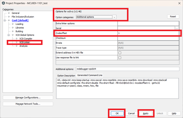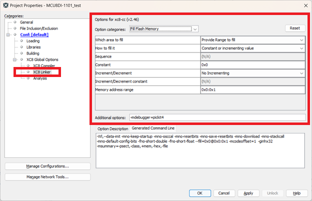 - Under the XC8 Linker categories tab, fill in the information as shown