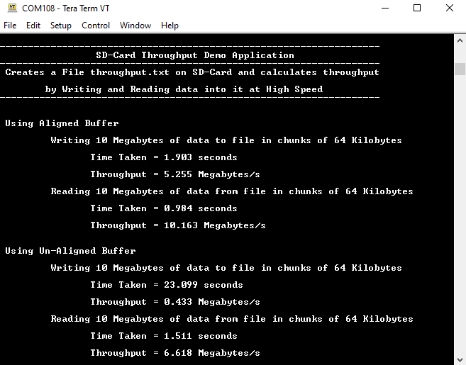 Application performs below filesystem operations and throughput calculations on SD-Card using both Aligned and Unaligned buffers
