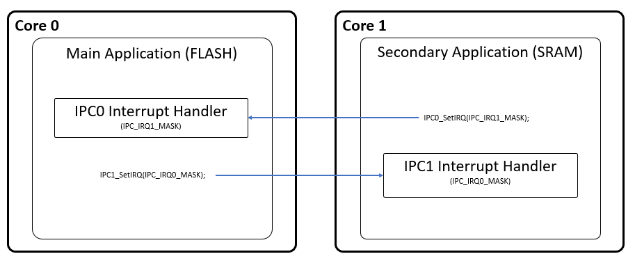 - IPC0 Interrupt Handler is responsible for capturing the interrupt signal (IPC_IRQ1_MASK) triggered by the Secondary Application. Therefore IRQ1 must be enabled.