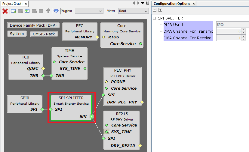When RF215 Driver's SPI dependency is connected to SPI splitter, a new field appears.