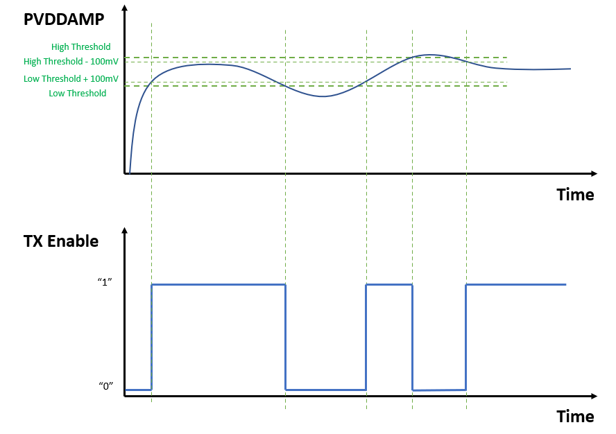 If this voltage is outside the allowed thresholds, PLC transmission must not be performed as it could destroy the output stage of the PLC driver amplifier. To enable PLC transmission, act on the TX Enable pin of the PL460.