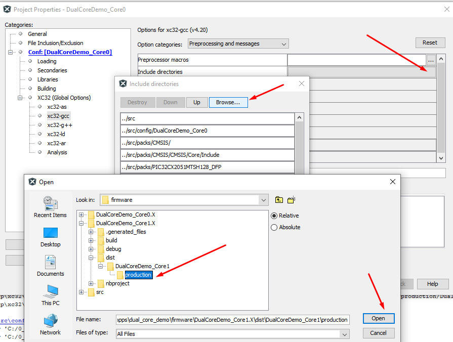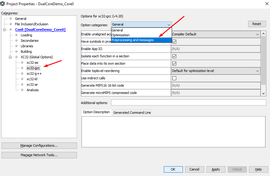 - Open Project Properties window and select xc32-gcc category and select Preprocessing