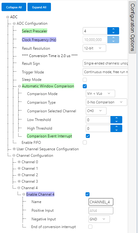 - If Automatic Window Comparison is available, enable it and its Comparison Event Interrupt. Otherwise, ADC End of Conversion Interrupt must be enabled.