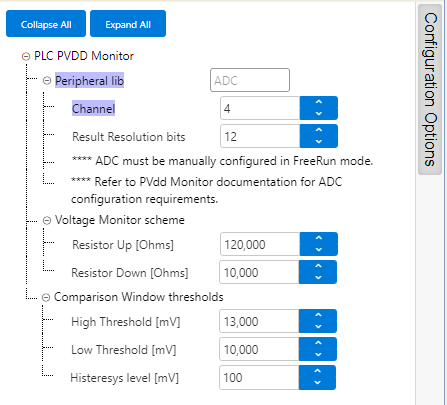 There are some configuration values which must be adjusted manually in ADC PLIB configuration options to match the values configured in PVDD Monitor service. These configuration values are the following: