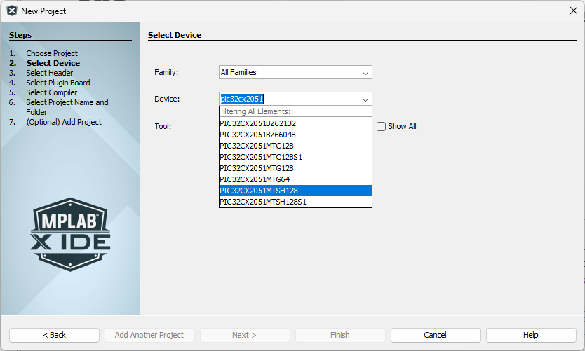 PIC32CX2051MTSH128 (the part mounted on PIC32CXMTSH-DB), and click Next.
